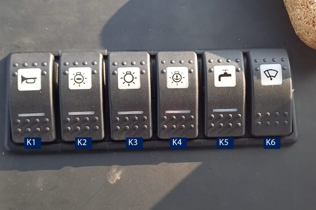 In de salon vindt u een schakelpaneel voor de omvormer (Victron Energy, zie foto). Zorg ervoor dat de omvormer altijd op ‘on’ staat. Tevens zit er een draaiknop op om het aantal Ampères in te stellen. Standaard staat deze meestal tussen de 8 en de 12 Ampère. Het is belangrijk dat de stand van de Ampères gelijk is of lager is dan het aantal Ampères dat op het stroompunt staat waar je aan aangesloten bent. Biedt een haven 12 Ampère stroom op de laadpaal, dan kun je de draaiknop op 12 zetten. Als de knop hoger staat dan het aantal Ampères dat op het stroompunt staat, dan bestaat de kans dat de zekering er uit gaat. Pas het aantal ampères aan en schakel de zekering weer aan.
