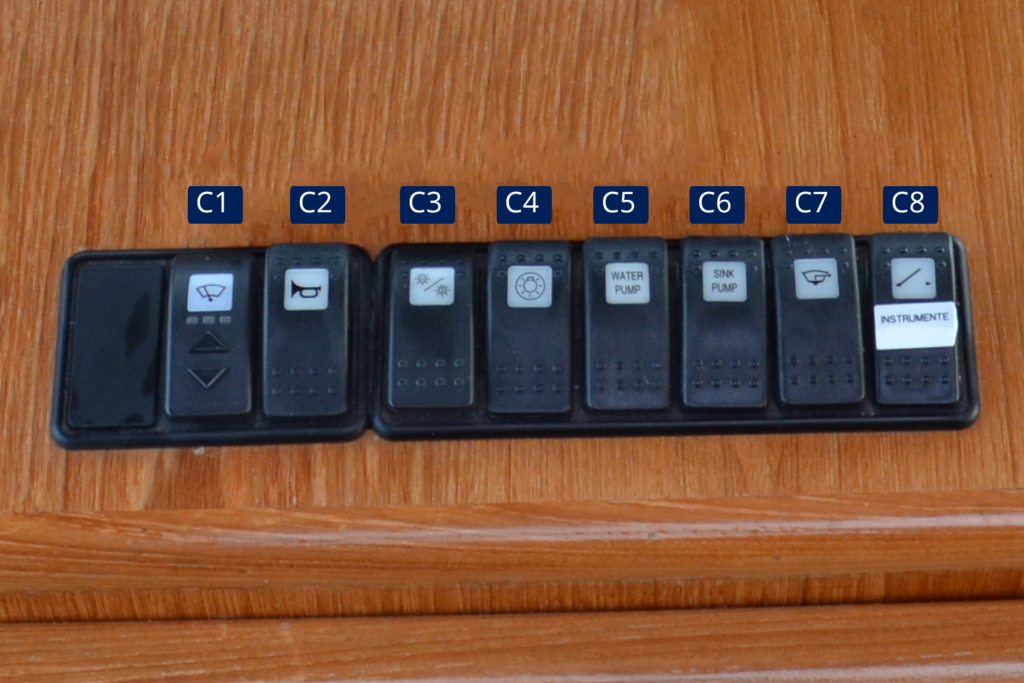 - Controleer de stroomvoorziening aan boord in de zekeringkast (in de salon). Controleer de controlelampjes voor 230 Volt via omvormer en voor 230 Volt via walstroom. Controleer ook of er een zekering uit staat in de zekeringkast. Geen controlelampje? Controleer of de stroom werkt op de stopcontacten en of de koelkast het nog doet. Indien hier ook geen stroom is, dan is de accuspanning vermoedelijk te laag en dient u eerst de boot aan landstroom aan te sluiten zodat de accu’s kunnen opladen.