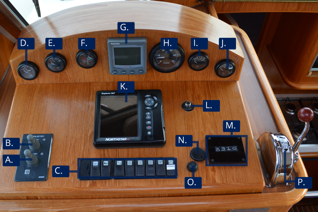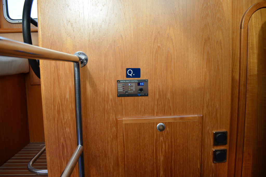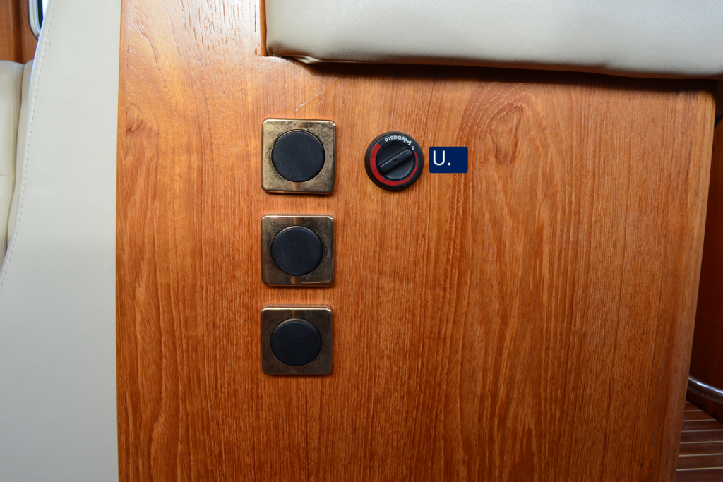 Deze boot heeft een elektrische boeg- en hekschroef. Dit betekent dat zowel de boeg- als de hekschroef is aangesloten op een afzonderlijke accu. De boeg- en hekschroef werkt uitsluitend bij een lopende motor. Voor het gebruik van de boeg- of hekschroef dien je het systeem aan te zetten door 2x op de powerknop te drukken. Je hoort hierbij ook een piepje. Je zult merken dat je na 1x drukken de pieptoon blijft horen, maar dat het systeem nog niet actief is. Pas na de tweede keer drukken, stopt het piepsignaal na enkele seconden en kan de boeg- en hekschroef gebruikt worden.